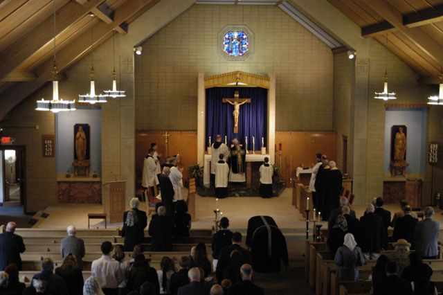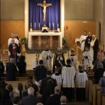 Present in the church were many clerics and religious, including eight priests who were “in choir,” seated close to the altar during the entire Mass, and assisting with candles in hand at various times. One of these priests was Abbot Gabriel Gibbs, O.S.B., of Saint Benedict Abbey in Still River. Three other monks were present in choir, two from Saint Benedict Abbey, and another from Saint Anselm’s Abbey in Manchester, New Hampshire. Two were Maronite priests, both long-time friends of Brother Francis: Father Anthony Weiler of the Saint Rafka Retreat Center in Vermont, and Chorbishop Joseph Lahoud, of Our Lady of the Cedars of Lebanon Parish in Jamaica Plain. An old friend of mine, Father Carlos Casavantes, FSSP, was also there.