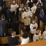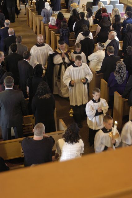 - A view of the celebrant and servers coming down the aisle.