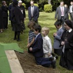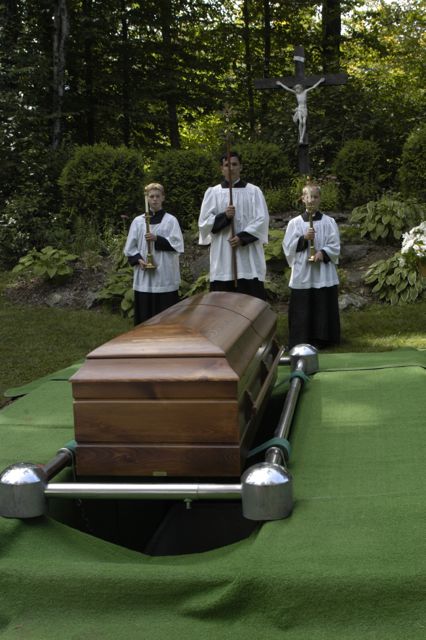 - Beneath our graveyard’s large crucifix, cross-bearer and acolytes stand at the head for the graveside service.