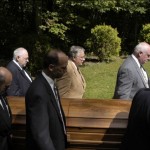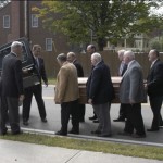 - The six pall bearers follow the corpse out to the hearse.
