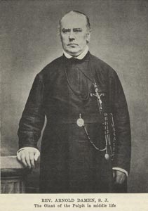 Arnold Damen (1815-1890) was born in Holland the year following Pope Pius VII’s restoration of the Jesuits. The great Belgian Jesuit missionary to the Indians, Father Pierre-Jean de Smet, brought him to America on one of his many recruiting-and-fund-raising trips back to Europe. In the fall of 1837, after a month at sea, the young aspirant arrived at Saint Stanislaus Novitiate, near the Jesuit mission at Florissant, Missouri. In 1843, he was ordained by the Archbishop of Saint Louis, Francis Patrick Kenrick, along with the Belgian, Peter James Aernoudt. (The Belgian “Aernoudt” became “Arnold” in America, where this Jesuit would eventually become a renowned devotional writer.)