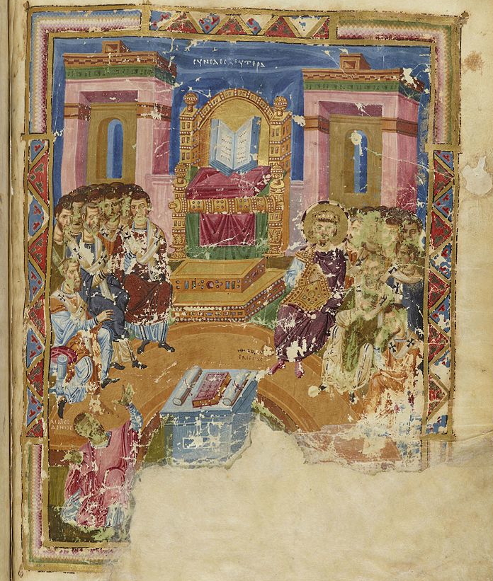 Ninth century Byzantine manuscript illumination of I Constantinople. Homilies of St. Gregory of Nazianzus, 879–883. Public domain (source).