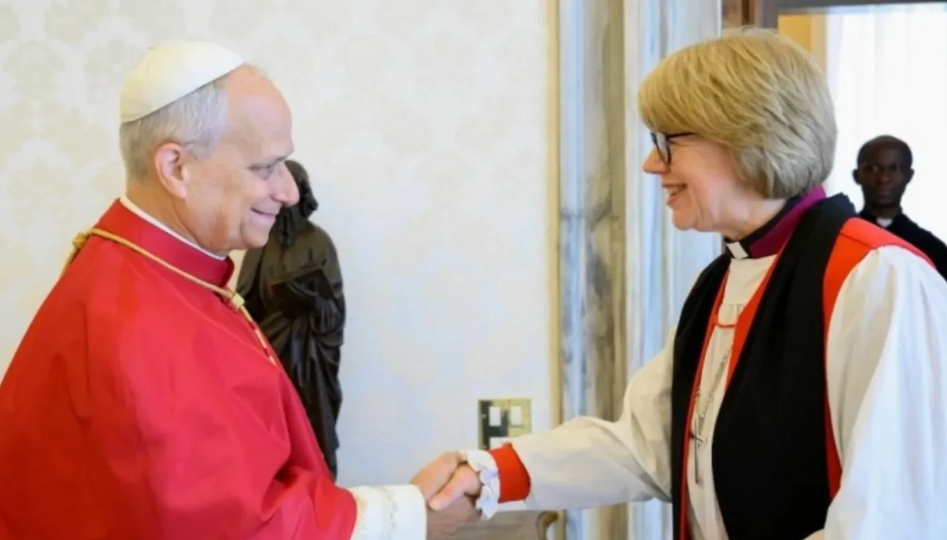 Pope Leo XIV receives Sarah Mullally, the first female Anglican archbishop of Canterbury, in the library of the apostolic palace, April 27, 2026 (Photo: Vatican Media)