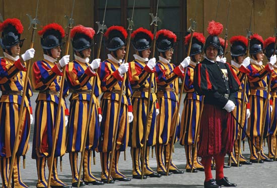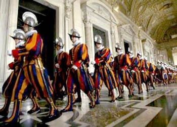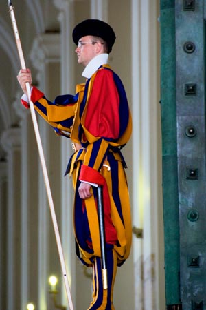 Imagine yourself a contestant on Jeopardy. The answer is… “The world’s longest-standing, but smallest, army in the world’s smallest independent state.” And what is the question? The only possible question is, “What is the Swiss Guard”? Officially, the name of the pope’s personal army is the Pontificia Helvetiorum Cohors. In 2006, the Guard celebrated the five hundredth anniversary of its founding by Pope Julius II, the “warrior pope.”