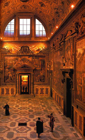 The new pope was a transitional figure. When he assumed the office in 1534, Christendom was being torn asunder by the Protestant revolt. The Church was about to institute the Catholic Counter-Reformation, purging itself of the corruption of the Renaissance era. So Paul was effectively a man between two eras during an age of serious conflict, both in the Church and in the world. Rome was in mourning over its own devastation, and Switzerland over the loss of its finest soldiers. Both had to overcome their sorrow and turmoil over these incredible losses before healing could begin. After the destruction resulting from the sack of the city in 1527, Pope Clement VII invited the great Michelangelo to return to the Vatican to decorate the wall above the altar of the Sistine Chapel. The work was agreed upon, but only begun after Clement died. On the vigil of All Saints’ Day in 1541, the cataclysmic piece was unveiled, revealing, in some of the scenes of the figures of the tormented and damned, something of the agonies of the Holy City during the sack. While many objected to the portrayal of naked figures on both the wall and the ceiling, thinking them more appropriate for the wall of a tavern than for the personal chapel of the Supreme Pontiff, for many others, including the new pope, Paul III, the work produced a kind of catharsis.