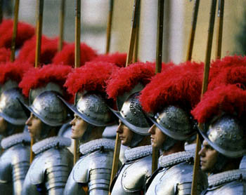 It should be noted that the Swiss Guards are mercenaries — paid fighters from one country in the employ of another country. This practice was very common in the sixteenth century, and still exists to some degree today. The Swiss had developed a stellar reputation as fierce fighting men. Using a distinctive method of fighting whereby infantrymen, carrying long pikes and halberds, formed very tight phalanxes, which would advance like a solid wall. (Halberds are long handled battle-axes. The Papal Swiss Guard still carry them today.) The Swiss were the only foot soldiers able to defeat cavalry since the time of the armies of ancient Rome. The high mountains, deep valleys, isolated towns and farms of Switzerland did not lend themselves to cavalry warfare. This unusual technique, coupled with their fierce love of independence, earned them a reputation as the best defensive fighting forces in Europe at the time.