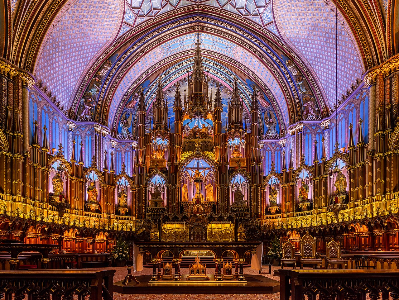 The glorious corpse of French-Canadian Catholicism: The interior of the Notre-Dame Basilica, located in the historic district of Old Montreal, in Montreal, Quebec, Canada. The interior of the basilica, built in Gothic Revival style, is impressive with vivid colors, stars and filled with hundreds of intricate wooden carvings and several religious statues. It was built between 1823 and 1829 after a design of James O’Donnell and it has become one of the landmarks of the city. Photo credit: Diego Delso, CC BY-SA 4.0, via Wikimedia Commons.