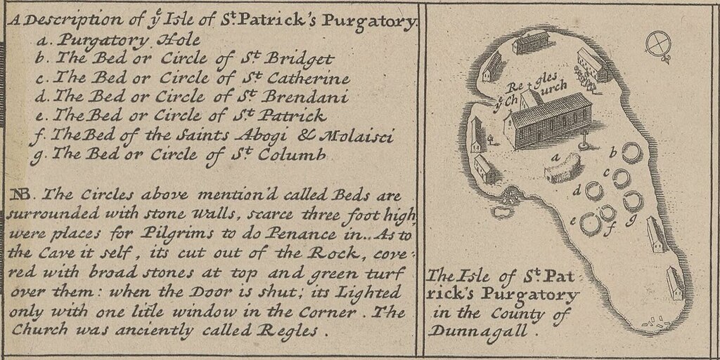 A map of British-occupied Ireland c. 1736 with bishoprics, cities, market towns, English estates, barracks, and fortifications, post and cross roads, ferries, bogs, and major sand bars along the Eastern shore marked. A chart on the bottom right lists the “troops” and companies of British soldiers stationed at various locations. Inset maps show the British Isles in Europe and detail maps of Dublin, Cork, Kinsale, Limrick, Waterford, Galway, the island of St. Patrick’s Purgatory, and the area around the Giant’s Causeway. Notes: A Description of ye Isle of St. Patrick’s Purgatory a. Purgatory Hole b. The Bed or Circle of St. Bridget c. The Bed or Circle of St. Catherine d. The Bed or Circle of St. Brendan’s e. The Bed or Circle of St. Patrick f. The Bed of the Saints Abogi & Molaisci g. The Bed or Circle of St. Columb NB. The Circles above mention’d called Beds are surrounded with stone walls, scarce three foot high were places for Pilgrims to do Penance in.. As to the Cave it self, its cut out of the Rock, covered with broad stones at top and green turf over them; when the Door is shut, its Lighted only with one litle window in the Corner. The Church was anciently called Regles. Printed for H. Moll over against Devereux Court in ye Strand, I. Bowles at the Black Horse in Cornhill, P. Overton Map & Printseller near St. Dunstans Church Fleetstreet, and T. Bowles Print & Mapseller next to the Chapter house in St. Pauls Church Yard. And by I. King Map and Printseller at the Globe in the Poultry. Public Domain via Wikimedia Commons.