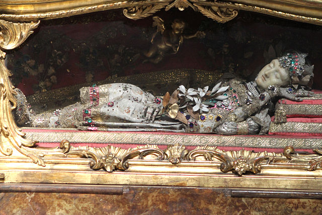 Reliquary of Saint Hilaria, in the Franciscan Church dedicated to Saint Jerome in Augsburg, Bavaria, photo by PictureObelix, some rights reserved (source)