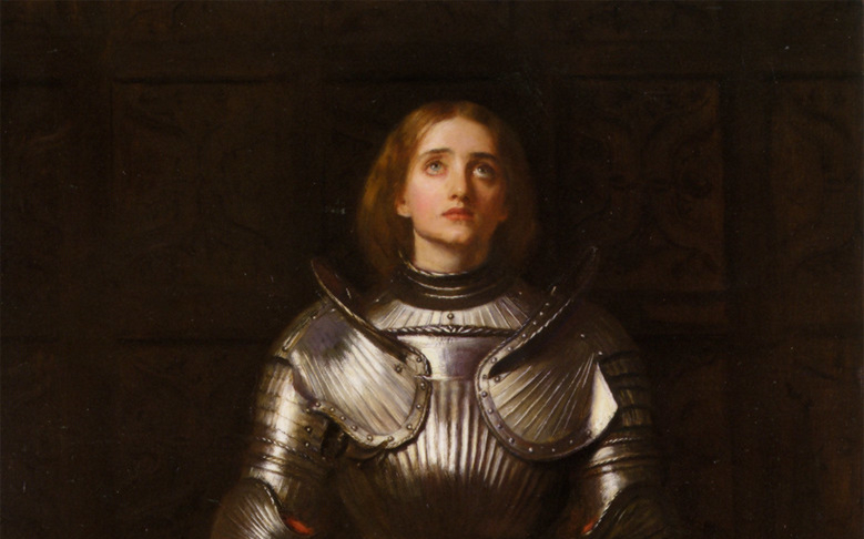 Oil painting, on canvas, of Joan of Arc wearing a suit of armor over a red skirt. Painted by John Everett Millais and published in 1865. Public Domain.
