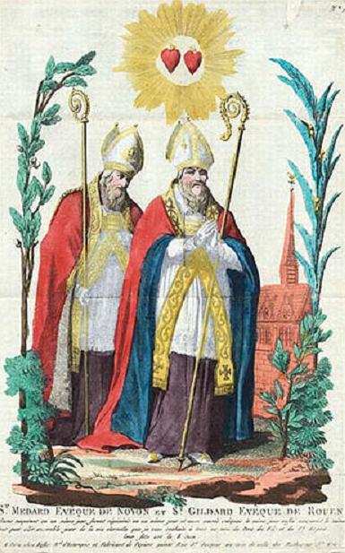 These two saints of France were, as we are told in the Roman Martyrology, twin brothers. They were born on the same day, consecrated bishops on the same day, and on the same day they died. Saint Medard was Bishop of Noyon. Saint Gildard was Bishop of Rouen. Their memories are most loving ones in northern France. Saint Medard began the custom of crowning each year as the Rose Queen the most virtuous and holy young Catholic girl of his diocese. If it rains on the feast of Saint Medard, the loving Catholic peasants of northern France take it as a sign that it will rain for forty days more. This same custom prevails in England with regard to Saint Swithin, whose feast day is July 2 and the feast of the translation of whose body is July 15, which day, for weather reasons, is called Saint Swithin’s Day.