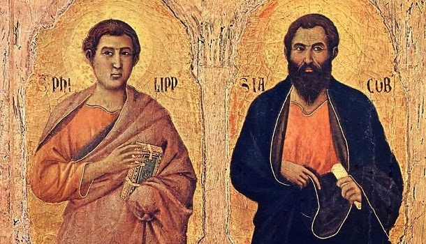 These are two of the Twelve Apostles, whose feasts are commemorated on the same day. This is because their bodies are kept in the same church in Rome, in the Basilica of the Holy Apostles. Saint Philip was crucified for the Faith. Saint James (James the Less), brother of Saint Simon and Saint Jude, and the first Bishop of Jerusalem, was thrown from the top of the Temple of Jerusalem by the Jews, and then clubbed to death in the street.