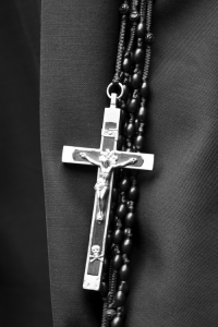 Our habit is a modified version of the Augustinian habit, with traditional monastic tunic, belt, and capuche. The modifications are the blazon of our Congregation on the capuche, and the fifteen-decade Dominican Rosary that hangs from the belt.