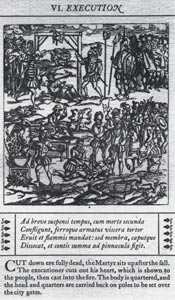 In Father Allen’s histories, he describes how the murder scene typically unfolded. Upon arrival at the place of execution, a proclamation for keeping the peace was read. The martyrs were not immediately let free from the hurdle (a frame or sled used to drag the prisoner to the place of execution), but while the first was hanging, the second was brought up and made to turn backward and look at the first, while he was being quartered. Occasionally, they were allowed to kneel and pray. Standing in the cart, and having the rope round their necks, they generally began their last prayers with the Sign of the Cross and the Pater, Ave, and Credo in Latin. Sooner or later they would be called upon to pray in English or with the Protestants. The latter was uniformly refused. At this point they were subjected to what was known as the “bloody question,” namely, what did they think of the excommunication of the queen by Pope Pius V? An opinion on this matter was not why the martyrs were there in the first place, but the answers inevitably given by the accused would only serve to excite the fanatics in attendance who came to gloat over the slaughter of the priests. Thus the execution could take place without much attention being given to the palpable injustice of the charges actually alleged against them.
