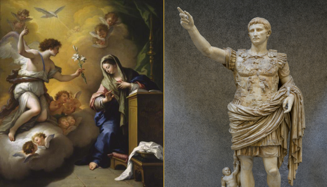 Left: The Annunciation, by Paolo de Matteis, Public domain, via Wikimedia Commons. Right: Augustus of Prima Porta, photo by Justin Benttinen (cropped from original), CC BY-SA 4.0, via Wikimedia Commons.
