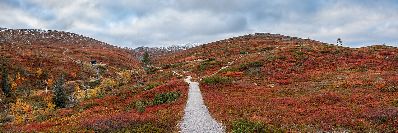 Path to Pallastunturi in autumn color display, Muonio, Lapland, Finland, 2021 September. Photo by Ximonic (Simo Räsänen), CC BY-SA 4.0, via Wikimedia Commons.