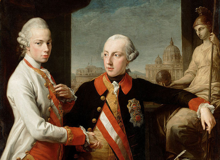 Portrait of Emperor Joseph II (right) and his younger brother Grand Duke Leopold of Tuscany (left), who would later become Holy Roman Emperor as Leopold II. Pompeo Batoni (1708–1787). Detail of oil on canvas by Pompeo Batoni (1708–1787).
