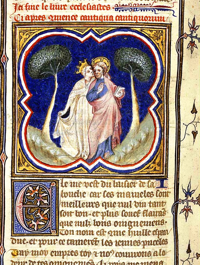 “The Bride (Ecclesia) and the Bridegroom (Christ).” Illustrator of Petrus Comestor’s ‘Bible Historiale’ | Illumination on parchment, France, 1372 | Museum Meermanno Westreenianum, The Hague (source)